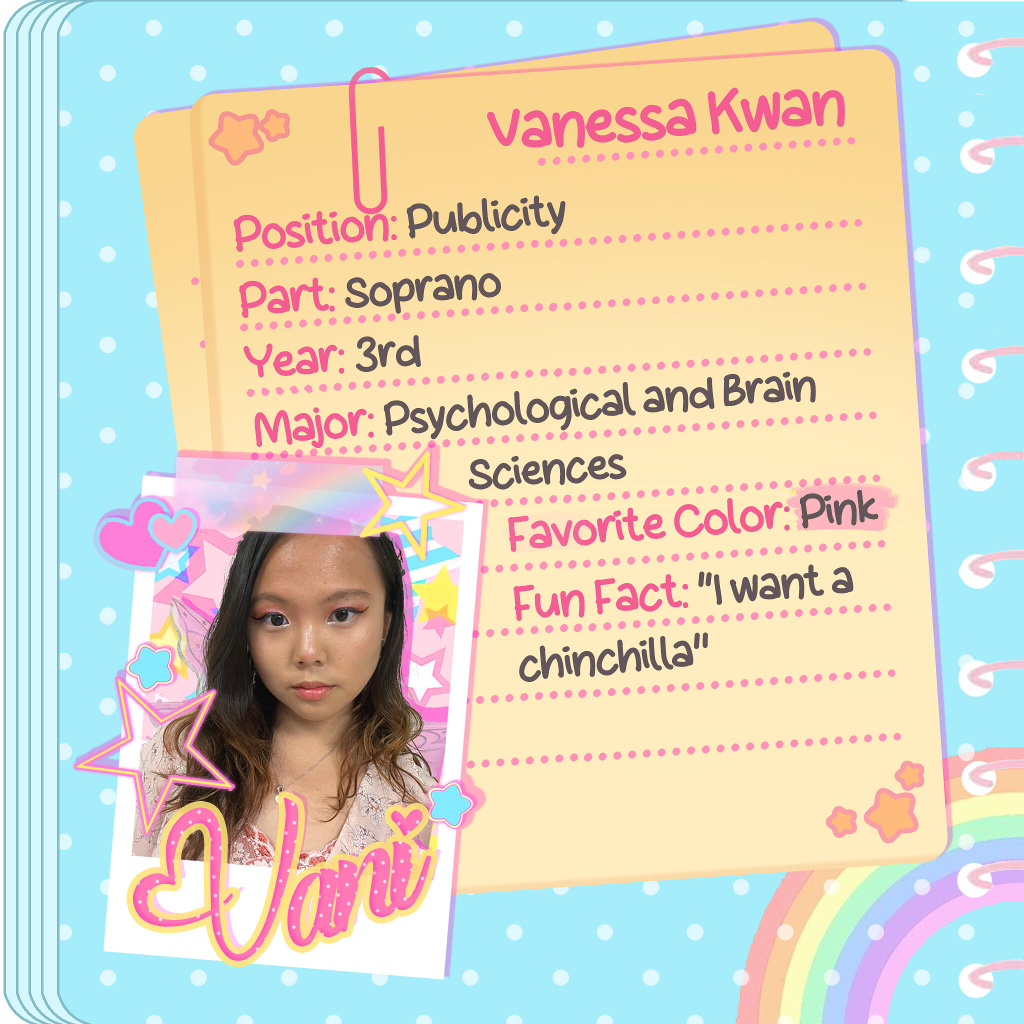 Hi! I am Vanessa Kwan. I am a third-year attending UC Santa Barbara as a Psychological and Brain Sciences Major and Art minor. I have many skills in technology, graphic design, art, video editing, and music.